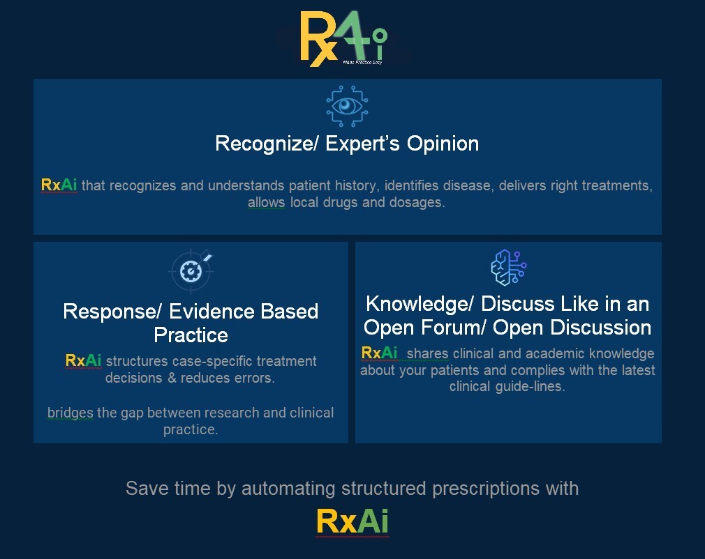 - On-Demand Knowledge Sharing: RxAI answers queries on prognosis, drug safety, risks, and benefits for better clarity.